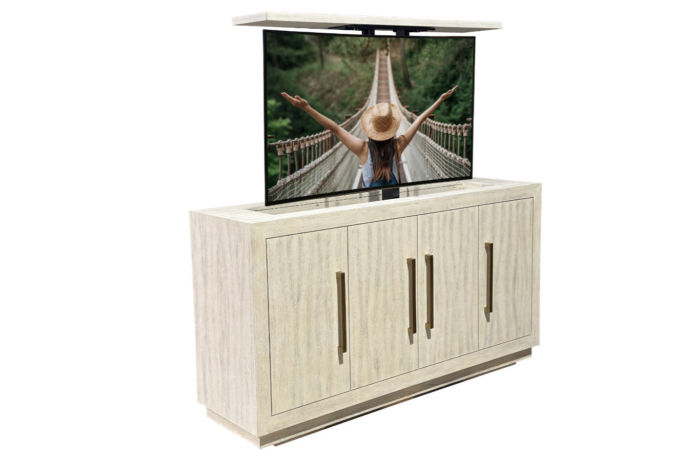 Elevate your contemporary home with the warm natural tones of our Arbor Buffet pop up TV lift cabinet. This unit has been designed and built specifically to provide safe, convenient storage for your 65-inch TV. With the number one rated motorized TV lift system carefully installed within the cabinet body, this modern classic is expertly crafted from beautiful natural timbers and finished to a designer contract standard.