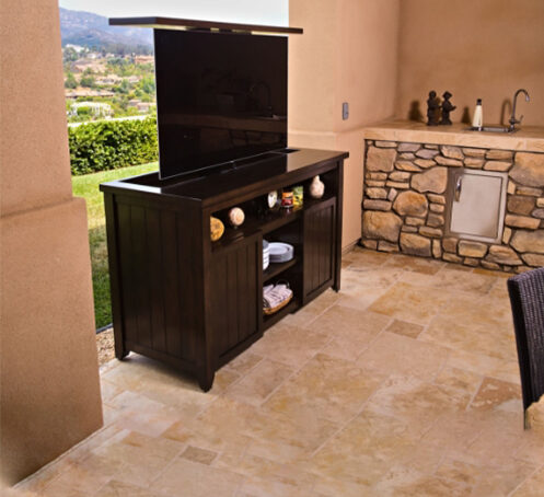 Veranda patio server lift cabinet hides TV and more